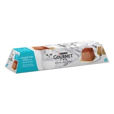 El teu gat és un amant de les llaunes de Gourmet? Et presentem una novetat! Gourmet Revelations Mousse amb un increïble pack de 4 piràmides de menjar humit, en forma de pastís i amb una irresistible cascada de salsa. Un nou format que ofereix una experiència culinària única als felins més exigents, per a aquells que gaudeixen de la varietat de textures, formes i sabors.